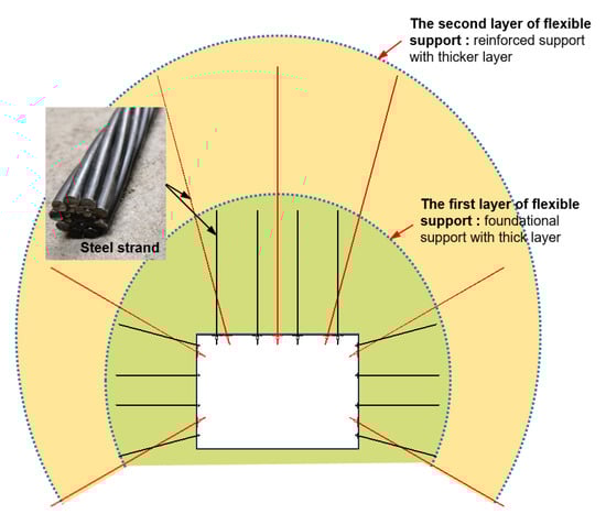 As shown in Figure 9, the double-layer flexible support technique adopts two lengths of steel strands. The first layer of flexible support is used to construct the thick fundamental anchorage layer, and the second layer of flexible support is used to realize the thicker reinforced anchorage layer. The advantages of this technique include the following: (1) fully utilizing the high load-bearing capacity of the steel strands; (2) by using the thick fundamental anchorage layer, a certain thickness of rock layers on the roof is consolidated into one unit, and anti-disturbance support is achieved; and (3) by using the thicker reinforced anchorage layer, the stability of the deeper rock masses can be fully mobilized in order to constrain the deformation of shallow, unstable rock masses, thereby further improving the anti-disturbance performance of the support structure.