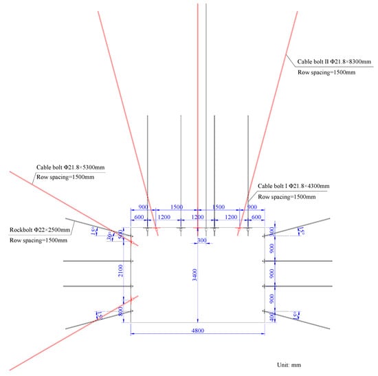 A support plan for the withdrawal roadway was designed, as shown in Figure 10, as follows: (1) The first layer of support for the roadway roof adopted a Φ 21.8 × 4300 mm flexible steel strand support, with a pre-tension of 200 kN. The second layer of support adopted a Φ21.8 × 8300 mm flexible steel strand support, with a pre-tension of 240 kN. (2) The first layer of support for the non-mining rib of the roadway adopted a Φ 22 × 2500 mm threaded steel anchor bolt support, with a pre-tightening force of 60 kN. The second layer of support adopted a Φ21.8 × 5300 mm flexible steel strand support, with a pre-tension of 200 kN. (3) The mining rib of the roadway adopted a Φ 22 × 2500 mm threaded steel anchor bolt support, with a pre-tightening force of 60 kN. When the working face arrived, the shearer cut away the mining rib, so the flexible steel strand support was not used. (4) The threaded steel anchor bolt and flexible steel strand were both anchored with MSCK2370 resin coil. (5) Metal mesh protection was employed for the roof and roadway sides, and W-shaped steel strips were also used to strengthen the protection.