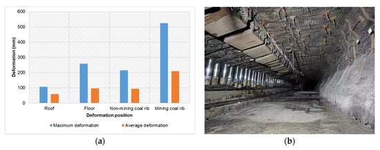 The effect of field application in withdrawal roadway 21405: (a) The deformation; (b) A photograph of withdrawal roadway 21405 after mining.
