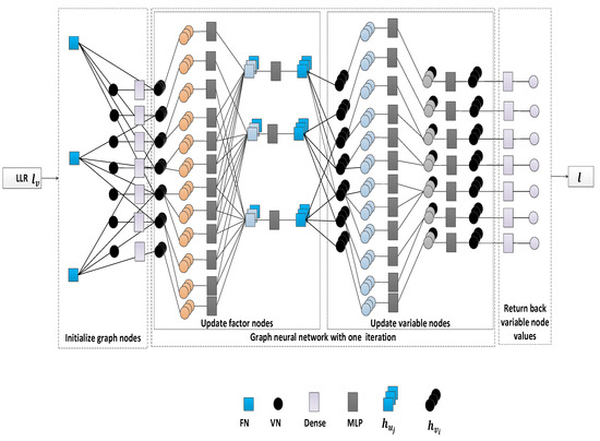 - Update the VN value aswhere denotes the parameters in VN. The decoding result is also output from this step. We may also use , , and operations, and the updated VN value is given by .