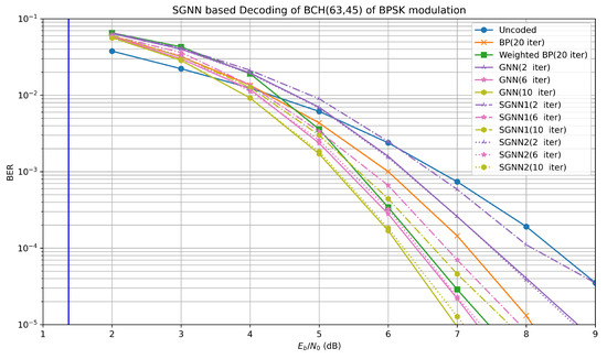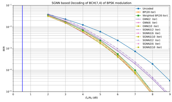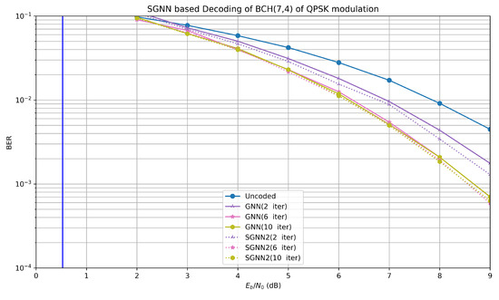 As shown in Figure 4 and Figure 5, the BER performances of the Uncoded, BP, Weighted BP, GNN, SGNN1, and SGNN2-based channel decoding algorithms are consistently improving for the BCH (7,4) code of BPSK modulation and QPSK modulation. The GNN-based channel decoding algorithm with only four iterations achieves an almost equivalent BER performance compared to the traditional BP decoder with twenty iterations. Overall, the BER performance of the SGNN1-based channel decoding algorithm degrades by 0.15 dB compared to the GNN-based channel decoding algorithm with the same number of iterations, and the BER performance of the SGNN2-based channel decoding algorithm degrades by 0.05 dB. However, SGNN1 and SGNN2 only use 2440 and 4840 parameters compared to the GNN, which uses 9640 parameters. BCH (7,4) has the same number of parameters as BCH (63,45), and the parameters are reduced to a quarter and a half, respectively, as listed in Table 2. According to our experience, the training weights of BCH (63,45) cannot achieve the desired BER performance when used in BCH (7,4).