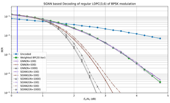 In order to increase the applicability of the GNN, we compare the GNN and the SGNN-based channel decoding algorithms for the regular LDPC code (v = 3, c = 6), when the training parameter T is 10 and the codeword length N is 100. In order to achieve fast convergence of training, MLP adds multiple neural network layers, the result is shown in Figure 6. The blue vertical line is the shannon limit of the code rate corresponding to reg LDPC codes. The SGNN1-based channel decoding algorithm performs slightly better than the twenty iterations of the weighted BP algorithm. In addition, when , the BER performances of the SGNN1 and SGNN2-based channel decoding algorithms are basically the same as that of the GNN-based channel decoding algorithm. As the length of the code increases, the BER performance gap between the SGNN algorithm and the GNN-based channel decoding algorithm gradually becomes larger, with a difference of about 0.2 dB; however, the BER performance gains between the BP algorithms and the GNN-based channel decoding algorithm tend to diminish with increasing n, but the weight is reduced from 28,700 to 32,016,352, as listed in Table 2.