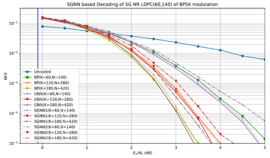 BER performance of GNN [22] and SGNN for 5G LDPC (60,140) code of BPSK modulation.