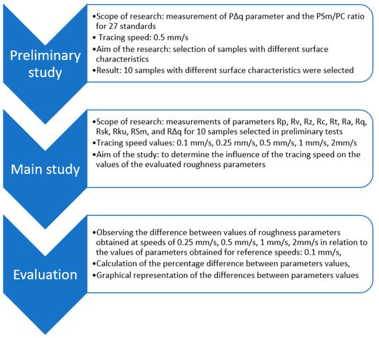 This was the reason why the authors of this article conducted studies to assess the impact of the tracing speed for a large number of samples with different types of irregularities. In this work, 11 roughness parameters were observed describing various features. The main aim of this study was to prove that the effect of tracing speed is different for different surface roughness parameters. The detailed objective of this research was to determine which of the analyzed parameters are less sensitive and which are more sensitive to changes in the tip travel speed. Compared to other papers examining the influence of tracing speed on roughness measurement results, this article is distinguished primarily by a large number of tested surfaces and a large number of analyzed roughness parameters.