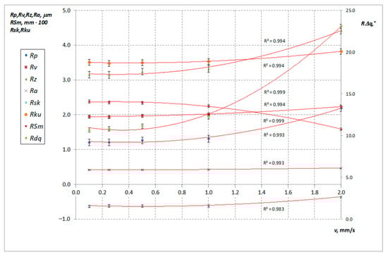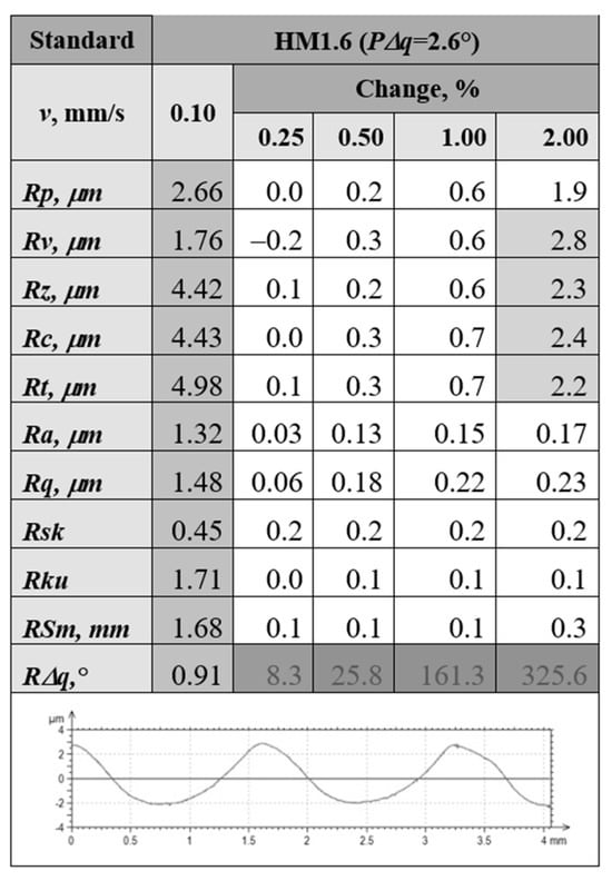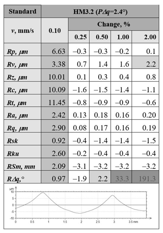 The smallest changes in the roughness profile parameters in response to changes in the tracing speed were observed for the surface of standard HM 3.2 (the surface after horizontal milling). This is a surface with a periodic profile characterized by small values of the slope angle, large distances between the profile elements, and at the same time, large height irregularity values. For this surface, the only significant changes were observed for the parameter RΔq. Figure 17 shows the nature of the changes in the individual parameters of the roughness profile as a function of the tracing speed for the HM 3.2 standard.