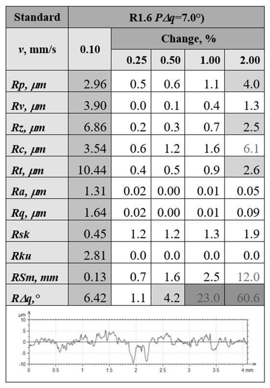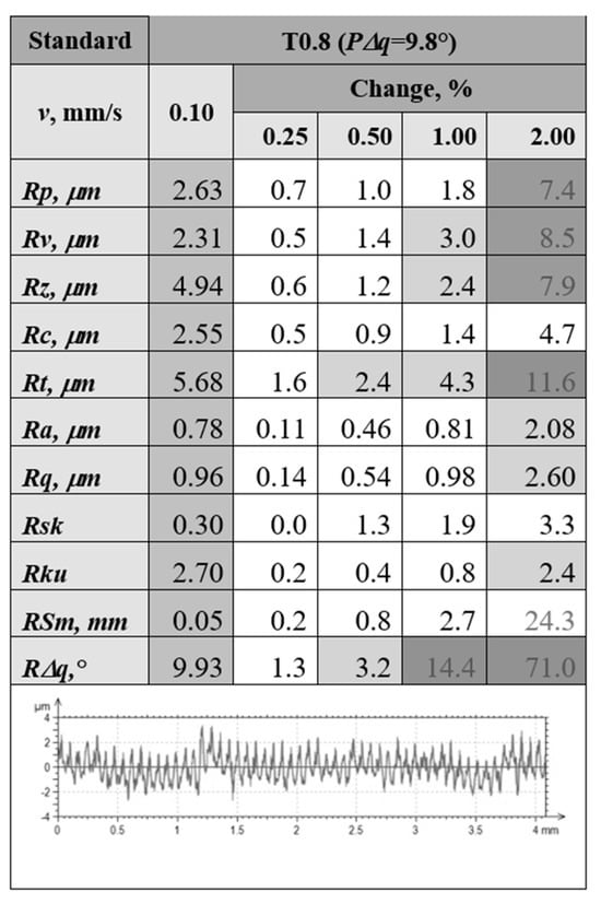 As in the case of the previous standard, the parameter most sensitive to the change in tracing speed for the surface engineered through reaming is RΔq. In the case of RΔq, the percentage error of the determination exceeded the assumed threshold of 2% at a speed of , and at , the error amounted to as much as 60.6%. Among the other parameters, the RSm parameter turned out to be the most sensitive to the increase in tracing speed. For RSm, the threshold value was exceeded at a speed of 1 mm/s, while at a speed of 2 mm/s, the determination error was −12%. Other parameters turned out to be much less sensitive to the increase in tracing speed. However, it was shown that at the maximum speed, the error value exceeded the threshold of 2% for all parameters, except Rp, Rz, Rc, and Rt.