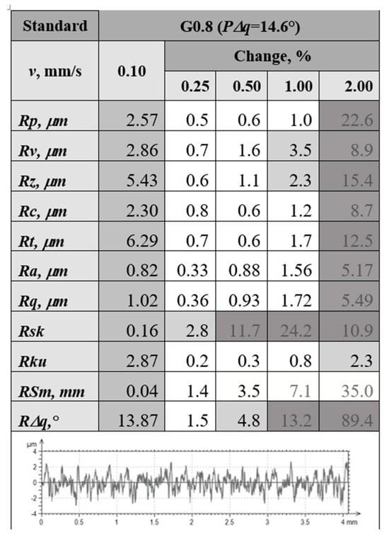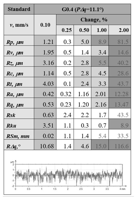 In the case of ground surfaces, the roughness parameters tend to be more sensitive to the increase in the tracing speed, particularly for surfaces with smaller irregularities. In the case of the G 0.4 standard, it was observed that at the speed of , the error threshold for the Rsk parameter was exceeded. With an increase in speed to , the threshold value was exceeded for six parameters, with nine parameters exceeded the threshold at . At the maximum speed of , errors of all parameters exceeded the threshold value, with some parameters exhibiting a very significant exceedance. For example, for Rp the error was 81.5%, and for RΔq, it was more than 116%.