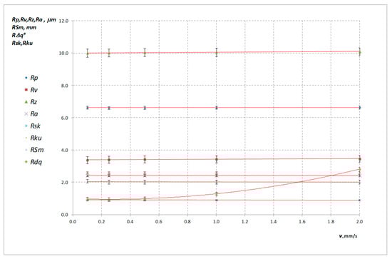 The largest changes in the values of the roughness profile parameters in response to changes in the tracing speed were observed for the surface of the standard FL 0.2 surface (the surface after flat lapping) and G 0.4 surface (the surface after grinding). These are surfaces with a random profile, characterized by large values of slope angle of the profile peaks and valleys, small distances between profile elements, and at the same time, small values of the height of the grooves. Figure 16 shows the nature of the changes in the individual parameters of the roughness profile as a function of the tracing speed for standard G 0.4.