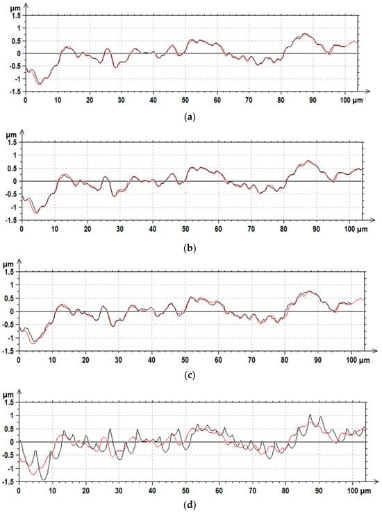 Comparison of fragments of standard G 0.4 measured at the following values of the tracing speed: (a) v = 0.1 and 0.25 mm/s, (b) v = 0.1 and 0.50 mm/s, (c) v = 0.1 and 1.0 mm/s, (d) v = 0.1 and 2.0 mm/s. Red line: the profile obtained with the use of the reference speed, black line: the profile obtained with the use of analyzed speed.