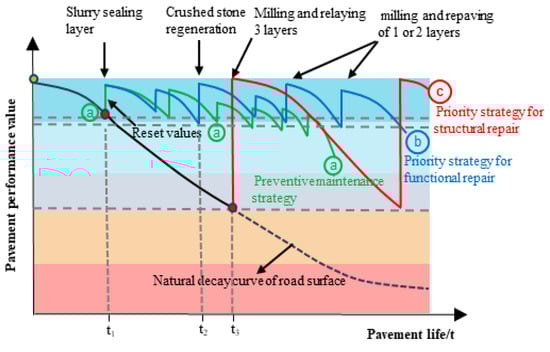 According to statistical analysis of performance testing data during the life cycle of rural roads in China and relevant literature surveys, road performance shows different attenuation trends when different maintenance opportunities and measures are selected (Yu.J [17] et al. 2015, Stein [18] et al. 2018). Figure 3 summarizes and presents decay curves of road performance under three different treatment strategies: preventive maintenance, functional repair priority, and structural repair priority. The bold curve (a) represents the early use of preventive maintenance techniques such as slurry sealing layer when small pavement damage occurs, resulting in slow performance decay to t1 and corresponding repairs to maintain high road conditions. However, as road age increases, overall pavement performance continues to decline in later stages until the road loses its intended service function. The bold curve (b) represents regular maintenance using techniques like crushed stone regeneration, milling, and repaving one or two layers when the pavement structure is damaged to a certain ex-tent and performance decays to t2 after the early adoption of preventive maintenance strategies to restore it to original technical condition. The bold curve (c) only starts selecting the necessary structural repair measures like milling and repaving three layers for maintenance when pavement performance continues to decline until the severe loss of use function at t3, restoring pavement performance quickly to its original level. This curve has a relatively long degradation period with average overall road performance.