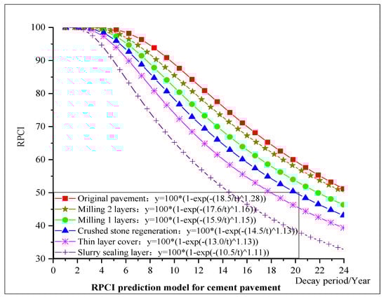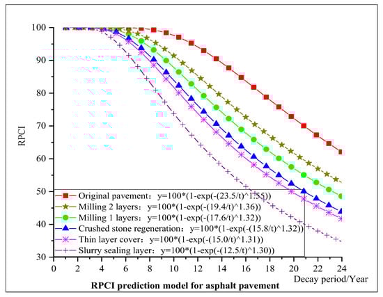 Based on the regular inspection data of rural roads in Jiangsu province from 2016 to 2021, the RPCI data of typical sections of rural asphalt pavement and cement pavement were fitted and analyzed. The main steps include: (1) grouping the inspection data and determining the corresponding initial decay year; (2) determining the basic parameters through data fitting analysis; (3) considering the impact of the internal health condition index RIPCI on the decay pattern of rural road pavement (RIPCI > 90, the decay coefficient is 1, 80 < RIPCI < 90, the decay coefficient is 0.8, 70 < RIPCI < 80, the decay coefficient is 0.6, RIPCI < 70 decay coefficient is 0); (4) according to the verification of other groups of data, optimize and determine the best parameters when the fitting accuracy requirements are met. Finally, RPCI decay models of five different treatment measures, such as slurry sealing layer, thin layer cover, crushed stone regeneration, milling and repaving one layer, and milling and repaving two layers, are established, respectively, as shown in Figure 4 and Figure 5 below.