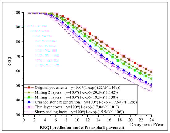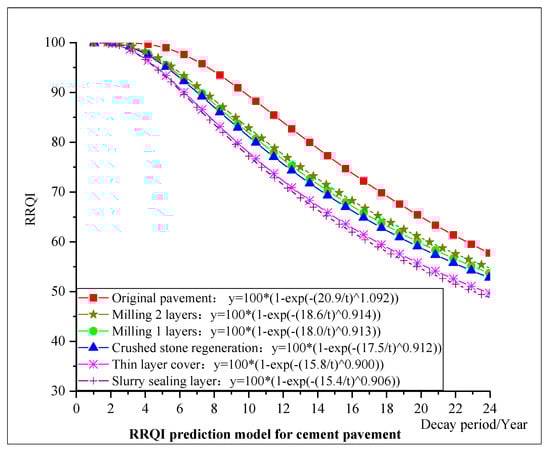 Based on the road condition inspection data from 2016 to 2021, the RRQI data of typical sections of asphalt pavement and cement pavement on rural roads in Jiangsu province were fitted and analyzed. The RRQI decay curves of five different treatment levels were established, including slurry seal layer, thin layer cover layer, crushed stone regeneration, milling and resurfacing one layer, and milling and resurfacing two layers, as shown in Figure 6 and Figure 7 below.