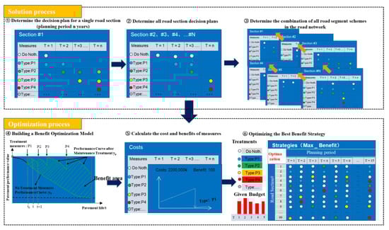 In the rural road network maintenance decision-making process, limited budget, complexity, insufficient program efficiency, and low optimization efficiency are common problems (Chen, W [20] et al. 2021). This paper introduces an improved heuristic optimization algorithm to solve these issues. The method is based on changes in pavement performance after maintenance measures are implemented, aiming to ensure optimal decision-making benefits throughout the life cycle (Chu, J. C [21] et al. 2018). By using a set decision-making model and benefit model, this approach determines the combination of maintenance measures that provides the most long-term benefits for each road section, optimizing a decision-making scheme strategy with the best benefits quickly, as shown in Figure 8. The solution process involves (1) determining the maintenance decision plan for each individual maintenance section within the road network one by one, (2)–(3) combining all maintenance road section decision plans to achieve all possible combinations of programs for the entire road network. (4) The optimization process is based on annual budget cost and a pavement performance-based benefit model as the main optimization link. (5) It calculates and determines the benefits and costs of each maintenance measure based on the benefits model, and (6) conducts a comparative analysis of the cumulative benefits of all strategy schemes through optimization algorithms to determine the best maintenance strategy.