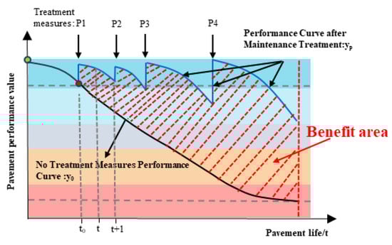Based on the combination of all road section schemes, the maintenance decision-making optimization work is carried out to determine the best maintenance benefit scheme. The research results define the maintenance benefit area as the area enclosed by the pavement performance curve yp after treatment measures and the natural attenuation curve y0 of pavement performance without measures, as shown in Figure 9. The Bene_cost ratio of benefit area to its cost is then taken as the final benefit evaluation value of rural road maintenance.