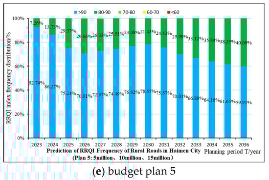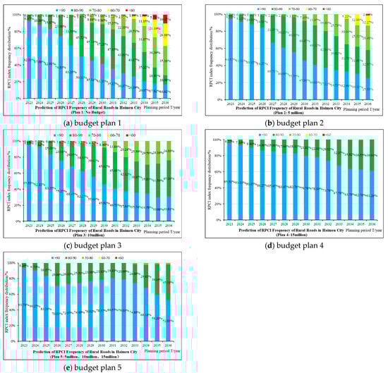 According to the existing rural road conditions in Haimen City, the performance requirements in the planning period (the overall average value is not less than 85), and the input costs in previous years. This paper preliminarily selects five annual budget options for decision-making calculation, mainly including plan 1: no budget; plan 2: 5 million (¥); plan 3: 10 million (¥); plan 4: 15 million (¥); plan 5: 5 million (¥); (previous four years: 2023–2026), 10 million (¥) (medium-term five years: 2027–2031), 15 million (¥) (later five years: 2032–2036). As shown in Figure 11 and Figure 12 below, the results of the RPCI grade frequency distribution and predicted value of road surface performance under the optimal strategy of different budget schemes are generated.