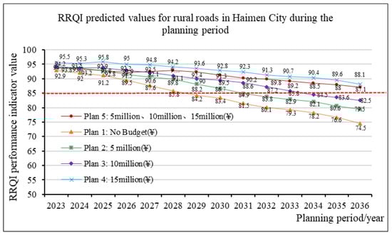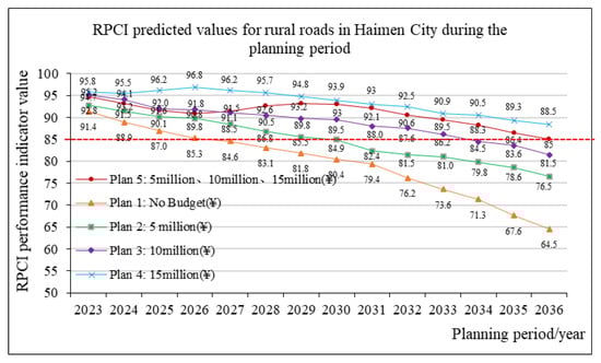Predicted RPCI of rural roads in Haimen City under different budget plans.