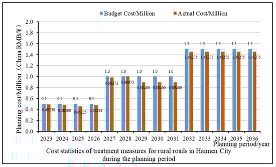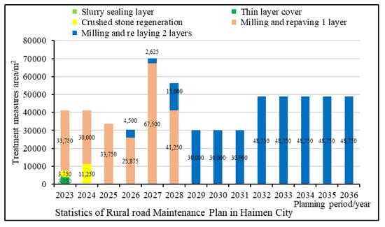 According to the planning scheme and forecast results determined in the above figure, it can be seen that the overall road condition of the Haimen rural road network is good. In the next two years, the maintenance plan will mainly adopt various treatment measures such as a slurry sealing layer, crushed stone regeneration, and milling and repaving one layer. With the increase in pavement service life, pavement performance will be degraded to a certain extent. In view of the possible local typical diseased sections of the pavement, the planning and decision-making results for 2025–2028 mainly adopt milling and repaving one layer to improve pavement performance. Finally, in the middle and late stages of the planning (2029–2036), pavement performance will be greatly reduced, and the decision-making result is that milling and repaving two layers of strong maintenance measures are adopted to maintain the pavement’s service level.