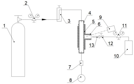 Scheme of an experimental plant for methane pyrolysis in tubes of various materials []: 1—a cylinder with methane; 2—reducer; 3—rotameter; 4—tube (reactor); 5—T-shaped pipe; 6—T-shaped pipe insulation; 7—filter; 8—gas sampling chamber; 9—pyrometer; 10—propane–butane cylinder; 11—reducer; 12—propane–butane flow control valve; 13—burner.