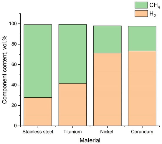 Figure 2 shows the contents of CH4 and H2 in the gaseous product of methane pyrolysis at 1100 °C in tubes of different materials. The results show that when using a tube made of corundum (MKR-95), the highest hydrogen yield of 73.35 vol.% is achieved (at 1100 °C and a methane flow rate of 2 L/h). The yield of hydrogen for the nickel tube was 71.27 vol.%, which is comparable to the yield of hydrogen for a corundum tube. For stainless steel and titanium tubes, the hydrogen yield was 27.75 and 41.51%, respectively.