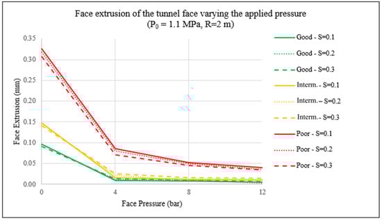 Figure 15, Figure 16 and Figure 17 provide a visual representation of the influence of tunnel face pressures on the extrusion behaviour of a tunnel with a larger radius of 3.5 m, and Figure 18, Figure 19 and Figure 20 for a tunnel radius of 5 m. Furthermore, it is worth highlighting that the thickness of the lining has a minimal impact on the face extrusion, resulting in only a slight variation of its value only for the Poor type of rock. Another noteworthy outcome is that increasing the diameter of the tunnel a corresponding increase in the face extrusion can be seen.