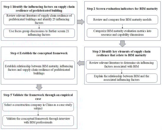 To depict the links between BIM use and the supply chain resilience of prefabricated buildings, this study mainly relied on an integrative review analysis, followed by an empirical case study. This study was organized in the following steps: (1) sorting out and identifying the influencing factors on the supply chain resilience of prefabricated buildings; (2) screening evaluation indicators for BIM maturity; (3) identifying key elements of supply chain resilience that relate to BIM use; (4) establishing a conceptual framework of BIM and supply chain resilience in the context of prefabricated buildings; and (5) validating the framework through an empirical case.