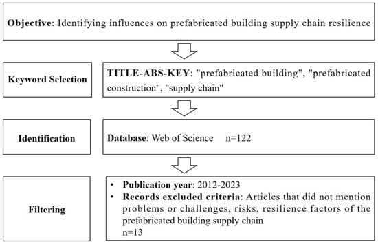 The influencing factors on the supply chain resilience of prefabricated buildings were extracted mainly from the existing literature. The relevant literature was collected and screened using a top-down approach: a literature search was conducted using specific keywords, followed by a manual review to exclude the literature that did not fit within the scope (see Figure 2). The Web of Science database was selected as the data source, with “prefabricated building”, “prefabricated construction”, and “supply chain” as key terms search within titles, abstracts, and keywords. The first relevant article was published in 2012, so the time frame was defined as 2012 to 2023. Initially, 122 documents were retrieved. Subsequently, the relevant articles collected from the search results were screened. During this process, we mainly used a manual review method. Focusing on the dilemma challenges, risk response, and resilience enhancement of the prefabricated building supply chain, we analyzed the retrieved literature, excluded articles that were not within the scope of the target research area, and finally identified 13 valid papers (Figure 2).
