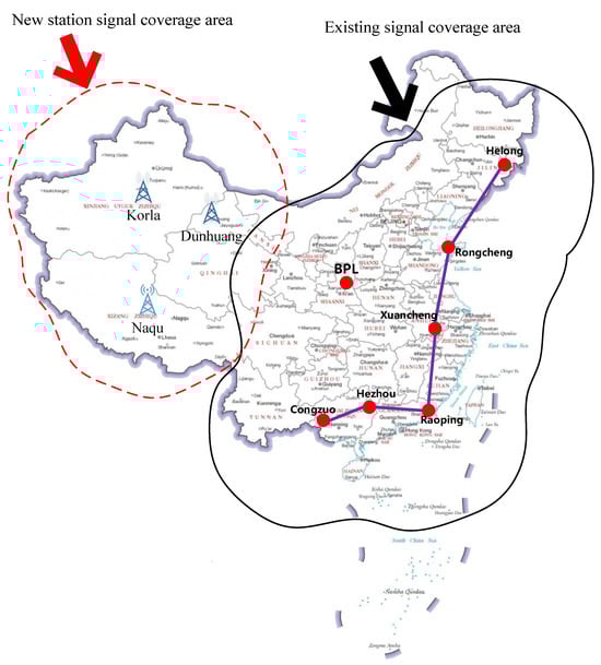 The BPL long wave time service station is located in the hinterland of China, Pucheng, Weinan, Shaanxi Province. According to the characteristics of signal (long wave) ground wave propagation, BPL mainly covers the central and eastern regions of China. Other Loran broadcaster stations are mainly distributed in the coastal and nearby areas of China. Their ground wave signal mainly covers the coastal and surrounding areas, filling the blind spots of BPL ground wave signal coverage in the southern, southeastern, and northeastern regions of China. The coverage of the time service signals in existing eLoran stations in China is shown in Figure 2. However, the southwestern, western, and northwestern regions of China are still the blind spots of ground wave signal coverage in the long wave time service system, which are unable to use eLoran signal to achieve high-precision timing and frequency calibration.