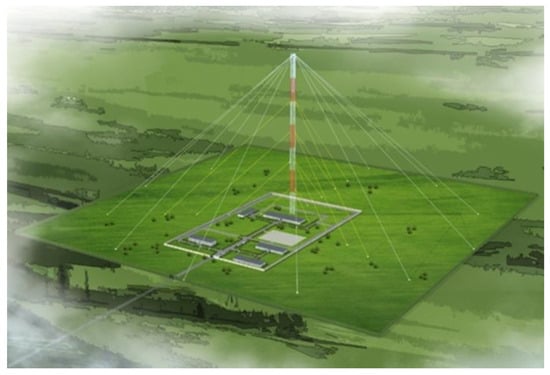 The transmission antenna adopts a single-tower umbrella-shaped antenna, mainly composed of an insulation tower with a height of 280 m and a top umbrella-shaped load. It is insulated with a grounding unit and a base insulator, and the insulation tower and top umbrella-shaped load serve as the main radiator of the antenna to achieve radiation transmission. The grounding unit reduces the ground loss resistance and ensures the antenna radiation efficiency. The main performance parameters of single-tower umbrella-shaped antenna are given in Table 2, Figure 5 and Figure 6.