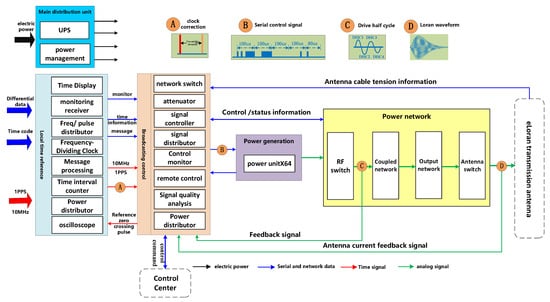 The main function of the time service broadcasting station is to transmit the eLoran time service signal, which is modulated to carry time service data (Coordinated Universal Time, UTC time), integrity monitoring, differential correction, and satellite ground fusion time service data. The time service broadcasting station is based on high-precision time frequency signals distributed by the operation control center and traced back to UTC (NTSC) (UTC time is maintained by the National Time Service Center). It controls solid-state transmitters to generate high-power eLoran time service signals suitable for wide coverage and high-precision reception. After being efficiently radiated by large eLoran transmission lines, timing terminals are uses to receive and decode UTC time information and 1PPS (pulse per second) signals through signal reception and demodulation [27,28].