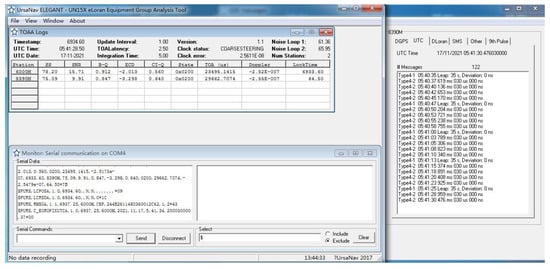 Through experimental observation, as shown in Figure 13, it can be seen that eLoran receivers can operate normally, and receivers with a Eurofix demodulation function can continuously output and correctly demodulate the data. Based on the above experimental data, it can be basically determined that the eLoran simulator generates a ninth pulse system signal superimposed on the existing Eurofix system, which does not affect the normal operation and performance of the existing receiver.