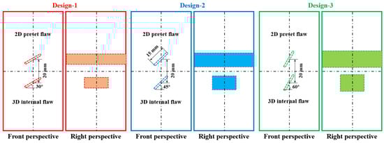 As the flaw inclination angle increases, the final surface cracks continuously connect the right tips of the twin flaws, and the cracks start from the left tip of the 2D flaw and stably extend upwards; cracks initiate from the middle point of the 2D preset flaw (Design-1 and 2 samples) and develop downwards and finally connect to the right tip of the 3D flaw; all cracks in the Design-3 sample only start from the flaw tips.