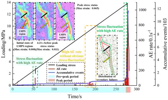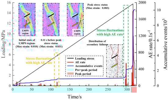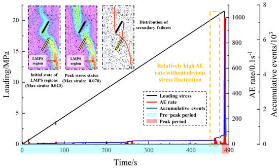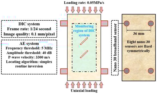 The uniaxial compression test was finished with a loading rate of 0.05 MPa/s, and the schematic diagram of the test and monitoring system is shown in Figure 2. The InSite-Lab AE monitoring system is produced by ITASCA Ltd. (US Minneapolis); eight Nano-30 sensors (resonant frequency is 300 kHz, and the monitoring frequency range is 125–750 kHz) are symmetrically positioned on both sides of the sample. The P-wave velocity in this type of rock-like specimen was 3300 m/s, and the event location is calculated by the Simplex Algorithm method; the detailed settings are introduced in reference []. The vic-2D software is applied for carrying out the DIC post-processing, and the original frames are captured by the Canon EOS camera. Previous similar studies proved that the maximum principal strain field obtained by the DIC technology can help to identify the final distribution of secondary cracks (accompanied by the relatively large maximum principal strain, abbreviated as the LMPS regions).