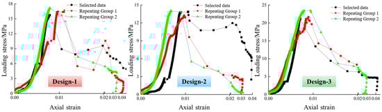 The stress–strain relationships of all rock-like samples are shown in Figure 3, and the results in each group show good consistency in sample strength and curve slope; the maximum and minimum average UCS values occur in Design-3 and Design-2, respectively. When the samples reach the UCS status, the corresponding axial strains are commonly lower than 0.01.