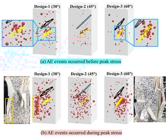 Figure 12 presents the event mechanism by the beach ball, and the selected events are neighboring to the internal 3D flaw. The %DC of all events in the Design-1 sample are less than 70 (tensile failures play the dominant role), and 50% of events belong to the typical tensile failure (%DC is less than 40). In the Design-2 and 3 samples, events that are located at the middle position in the projection view belong to the pure tensile or tensile-shear failures, and events that occur near the flaw boundary present as the typical shear failures.