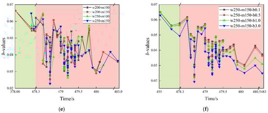 Because the b-value is derived from statistical analysis (only related to AE event time and magnitude), the data window width (abbreviated as “w” in the following figures), moving step length (abbreviated as “m” in the following figures), and bin width of magnitude (abbreviated as “b” in the following figures) are thus important factors influencing the speed and accuracy of calculations. Based on the previous works [], the suggested minimum AE event number for severity estimation is 200; we thus set the data window width to 200 and 250 and set the moving step length to 100 and 150.