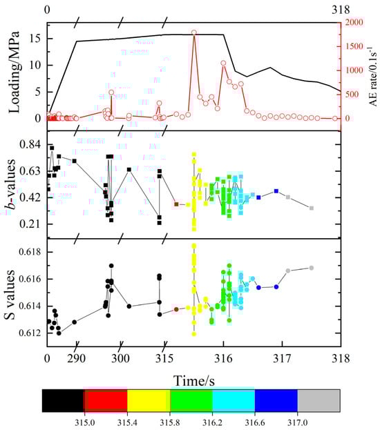 The S value (used to quantify AE activity) comprehensively estimates the time, space, and intensity of secondary failures in a rock sample. It involves the event rate, average energy, and maximum energy, which help to reflect the concentration degree and energy scale of AE sources inside the rock mass []. The corresponding calculation formula is as follows: