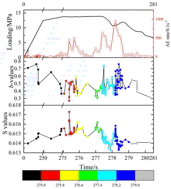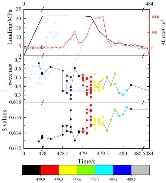 Curves of the loading stress, b-values, and S values (Design-2 sample).
