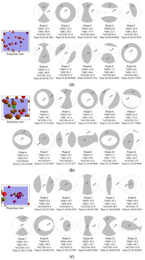 Figure 7 illustrates that many AE events initially gather around the 3D internal preset flaw before reaching the UCS status, and the detailed mechanism of AE events is explained by the Moment tensor inversion method []. Based on this method, the moment tensor of an AE event can be separated into three components, isotropic (ISO), double couple (DC), and compensated linear vector dipole (CLVD) [], and the corresponding calculation formula is expressed as follows: