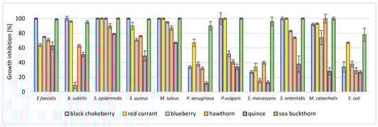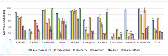 Taking into account that MIC and MBC values were not measurable for most microorganisms, as it is shown in Table 2, but the inhibition of the growth of microorganisms was observed, the inhibition degree by the highest tested concentration is presented in Figure 1 and Figure 2. The highest activity, as shown above, demonstrated that the extracts obtained from chokeberry, sea buckthorn, and red currant had an inhibition degree reaching 100% against a majority of indicator bacteria excluding P. aeruginosa, E. coli, M. catarrhalis, and S. marcescens. However, it is worth underlining that blueberry and hawthorn extracts exhibited a high activity towards E. faecalis, S. epidermidis, S. aureus, M. luteus, S. Enteritidis, and M. catarrhalis, causing more than 50% of inhibition of growth. Quince extract showed an activity higher than 50% of growth inhibition only towards E. faecalis, S. epidermidis, and M. luteus. Comparing the sensitivity of microorganisms, it could be stated that Gram-positive bacteria were more susceptible to fruit extracts. Among the Gram-negative bacteria, P. aeruginosa, S. marcescens, and E. coli were least sensitive.