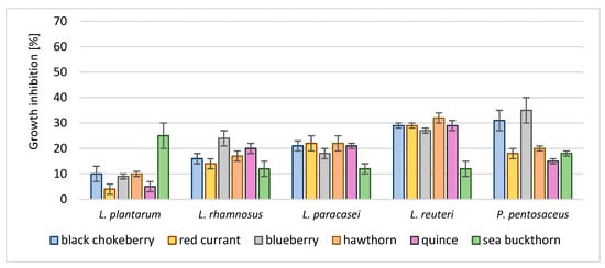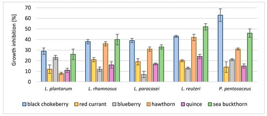 Similarly to the results concerning antibacterial activity towards pathogenic strains, MIC and MBC values in the case of LAB inhibition were not measurable for most microorganisms. Therefore, the inhibition degree of LAB strains by the highest tested concentration of extracts and lyophilisates is presented in Figure 3 and Figure 4, respectively. The highest activity was demonstrated in extracts obtained from chokeberry, sea buckthorn, and hawthorn; however, the inhibition degree was usually below 50% excluding the activity of sea buckthorn towards L. reuteri and chokeberry extract towards P. pentosaceus, inhibited in 52 and 62%, respectively. The inhibition degree of red currant, blueberry, and quince extracts was much lower and did not exceed 30%. It can be noticed that L. plantarum showed the least sensitivity to the extracts.