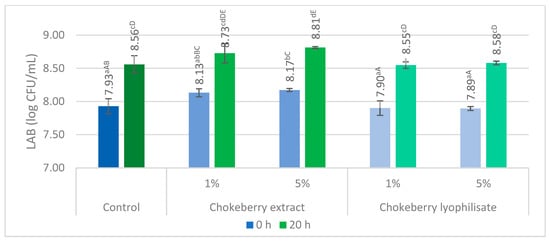 Total number of LAB in oat beverages with the addition of chokeberry extract and lyophilisate. Averages with different small letters (a–d) are significantly different at p ˂ 0.05 (comparison within a group of samples with the addition of extract and lyophilisate separately). Averages with different capital letters (A–E) are significantly different at p ˂ 0.05 (comparison between groups of samples with the addition of extract and lyophilisate).