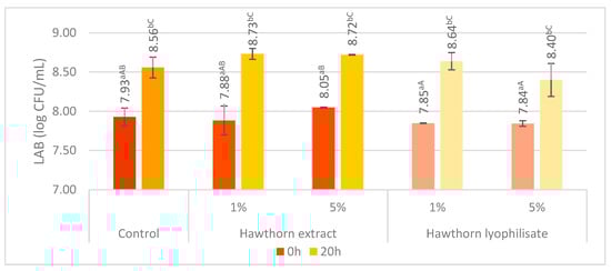 Total number of LAB in oat beverages with the addition of hawthorn extract and lyophilisate. Averages with different small letters (a,b) are significantly different at p ˂ 0.05 (comparison within a group of samples with the addition of extract and lyophilisate separately). Averages with different capital letters (A–C) are significantly different at p ˂ 0.05 (comparison between groups of samples with the addition of extract and lyophilisate).