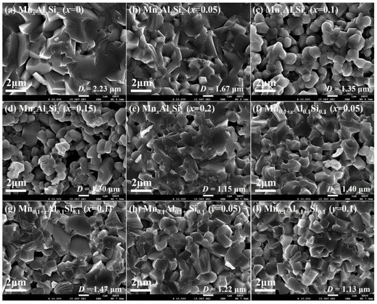 Figure 2a–e illustrate the changes in the microstructure with increasing x in sintered Sr0.8Ca0.2Fe11−3xMnxAlxSixO19−d samples. The average grain size (D) was determined using a random intercept method applied to SEM micrographs and is presented in the lower right corner of each figure. Notably, when Mn–Al–Si substitutions are absent (x = 0), the average grain size is the largest, at D = 2.23 μm. With increasing x, there is a consistent trend of decreasing D. Given that the substitution of Mn–Al–Si does not significantly affect the MCA of M-hexaferrite, it can be explained that HC is primarily dependent on D. As discussed earlier in Equation (1), the coercivity of an individual grain (hC) exhibits an inverse relationship with its size (d), which can aptly account for these variations. The abnormally high intensity of the (00l) plane peaks in the XRD pattern of the x = 0 sample (Figure 1a) is attributed to the growth of hexagonal plate-like crystals, which can be observed in Figure 2a. In Figure 2c–e, for samples with x ≥ 0.1, a uniform grain size distribution is evident, with D ranging between 1.15 and 1.33 μm. In Figure 2f,g, when the Mn substitution level is increased to 0.15 and 0.2, a slight increase in D is observed. However, in Figure 2h,i, as the Al substitution level increases to 0.15 and 0.2, there is a slight tendency for D to decrease. The apparent density of the sintered samples for each composition is presented in Table 1.
