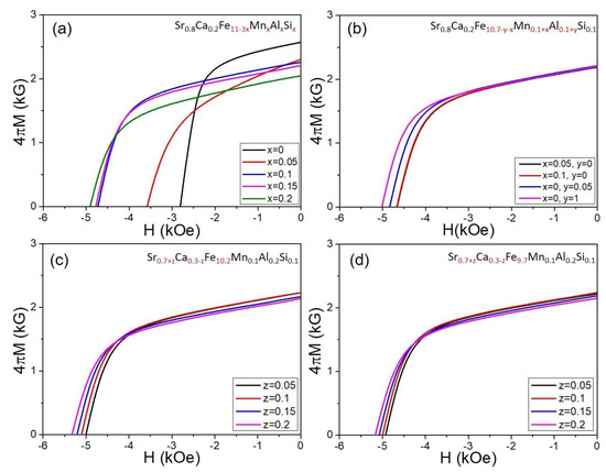 Demagnetization curves of hexaferrite samples, (a) Sr0.8Ca0.2Fe11−3xMnxAlxSixO19−d, (b) Sr0.8Ca0.2Fe10.7−3xMn0.1+xAl0.1+ySi0.1O19−d, (c) Sr0.7+zCa0.3−zFe10.2Mn0.1Al0.2Si0.1O19−d, and (d) Sr0.7+zCa0.3−zFe9.7Mn0.1Al0.2Si0.1O19−d (0 ≤ x, y, z ≤ 0.2).