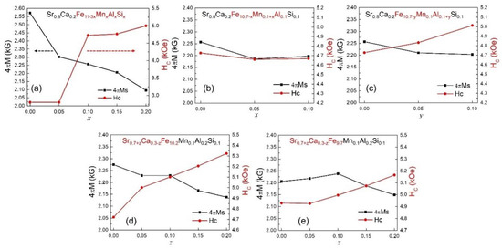 Figure 3a–d display the demagnetization curves (4πM-H) of samples for each composition in the four series. Additionally, to facilitate an easy assessment of the changes in the residual magnetization (4πMr) and coercivity (HC) of the samples obtained here, we have plotted them as a function of the substitution level x, y, and z in Figure 4a–e. The precise data values are provided in Table 1. In Figure 3a, it can be observed that the demagnetization curves vary significantly with respect to the Mn–Al–Si substitution level, x. As x increases, 4πMr decreases, while HC shows an increasing trend. When there is no secondary phase, 4πMr can be expressed in terms of the MS, sintered density (ρ), and squareness (S), as follows [7,23]: