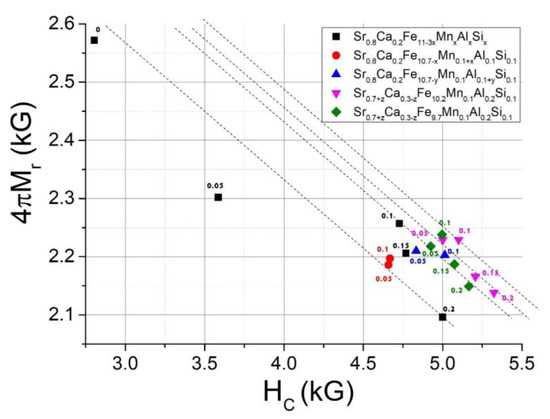 In ferrite magnets, it is well-known that there is a trade-off relationship between 4πMr and HC. To confirm this trend observed in the five series of compositions in this study, the 4πMr and HC of all the samples were plotted as points in a two-dimensional plane (x, y) and presented in Figure 5. Each series of samples is represented by shapes and colors of the same type. Furthermore, a trend line with a consistent slope from the bottom-left to the top-right are drawn from the coordinate points of each series, helping distinguish the positions of the points. A specific point that trends towards the upper-right direction indicates superior permanent magnet properties. In the first series, Sr0.8Ca0.2Fe11−3xMnxAlxSixO19−d (x = 0, 0.05, 0.1, 0.15, 0.2), it is confirmed that the composition with x = 0.1 is positioned most towards the upper-right direction. In the second series, Sr0.8Ca0.2Fe10.7−3xMn0.1+xAl0.1+ySi0.1O19−d, when additional Al substitution (y = 0.1) is applied, it is observed that this composition is located most towards the upper-right direction. Finally, in the two series where the Sr:Ca ratio is adjusted, Sr0.7+zCa0.3−zFe10.2Mn0.1Al0.2Si0.1O19−d, Sr0.7+zCa0.3−zFe9.7Mn0.1Al0.2Si0.1O19−d (z = 0, 0.05, 0.1, 0.15, 0.2), it is again confirmed that the composition with z = 0.1 is positioned most towards the upper-right direction. This analysis reaffirms the validity of the step-by-step optimization process to derive the final optimized composition for the permanent magnet properties in each series of compositions.