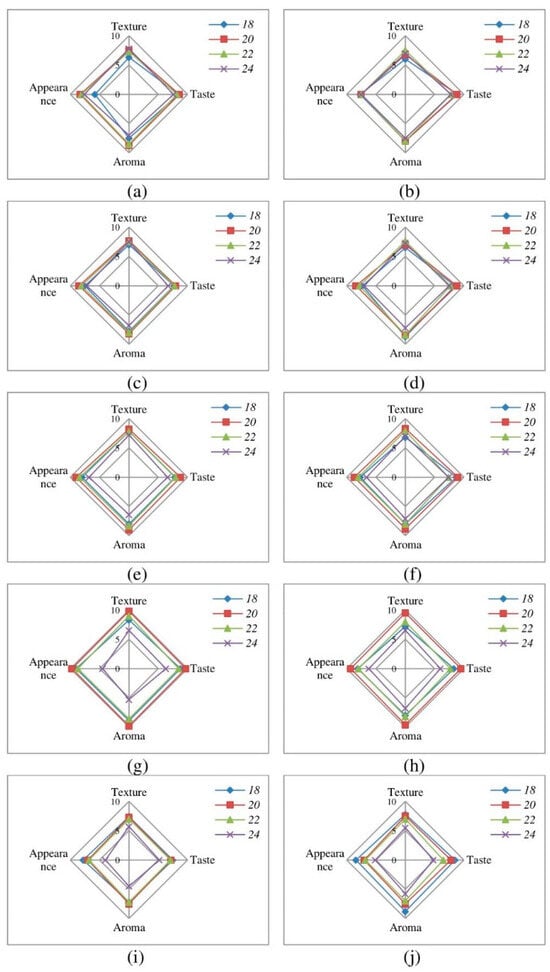 Sensory evaluation of black currant and sea buckthorn berries freeze-dried at shelf temperatures of 35 °C ((a)—black currant, (b)—sea buckthorn), 40 °C ((c)—black currant, (d)—sea buckthorn), 45 °C ((e)—black currant, (f)—sea buckthorn), 50 °C ((g)—black currant, (h)—sea buckthorn), 55 °C ((i)—black currant, (j)—sea buckthorn), and sublimation duration of 18, 20, 22, and 24 h.