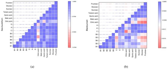 Pearson correlation analysis based on the content of vitamins, organic acids, and sugars in the samples during freeze-drying. Heat map of Pearson correlation analysis ((a)—black currant samples, (b)—sea buckthorn samples).