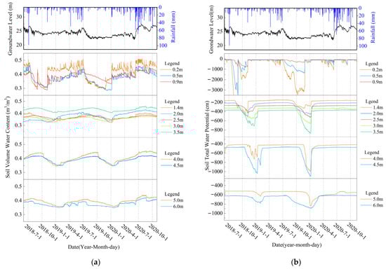 The data (soil volume water content and soil water potential) of the 3E profile, rainfall data, and groundwater level data were monitored from 1 January 2018 to 14 November 2020, and were used to show the dynamic changes (Figure 2) of the soil volume water content and soil water potential as they were affected by rainfall and the groundwater level over time. According to the soil volume water content dynamic change diagram (Figure 2), we were able to determine that abundant rainfall can make the soil volume water content remain at a high level all the time, except for the shallow layers during a drought period. We can see that there was an obvious stratification phenomenon within the same period, and the soil profile of the field test site can be mainly divided into zones according to this phenomenon by soil volume water content dynamic changes at different depths in profile 3E (Figure 2). The vadose zone of the field test site included the following zones: the sensitive zone of rainfall infiltration (0–1.4 m), the buffer zone of rainfall infiltration (1.4–3.5 m), and the migration zone of rainfall infiltration (3.5–5.0 m). The changing trend of the soil moisture of soil layers at 5.0 m and 6.0 m was similar to the 4.0 m and 4.5 m soil layers, with an obvious difference, but the same could be observed with the groundwater level’s rising and falling. The obvious difference was mainly caused by the groundwater level, which is consistent with the previous research results []. Finally, we regarded the soil layer at the depths from 5.0 m to 15.0 m as the rainfall infiltration and groundwater level co-influenced zone.