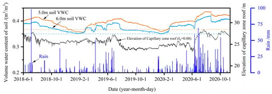 The dynamic change diagram of rainfall, soil volume water content, and capillary zone roof elevation in profile 3E. Light blue dashed line and light orange dashed line represent the soil layer elevations at the depths of 6.0 m and 5.0 m.